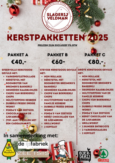 Ook dit jaar bent u bij ons weer op het juiste adres voor (h)eerlijke lokale kerstpakketten. Klik hier om ons assortiment te bekijken!